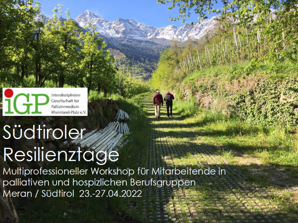 Die Interdisziplinäre Gesellschaft für Palliativmedizin Rheinland-Pfalz veranstaltet im nächsten Frühjahr ihre ersten „Südtiroler Resilienztage“ in Meran/Südtirol, ein multiprofessioneller interaktiver Workshop für Mitarbeitende in palliativen und hospizlichen Berufsgruppen.